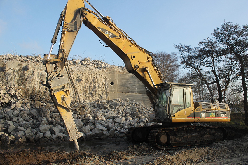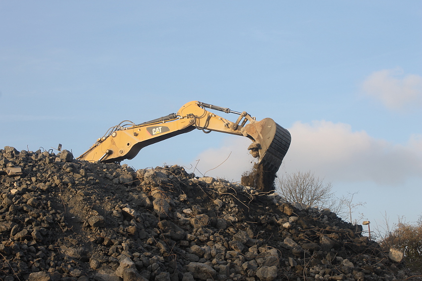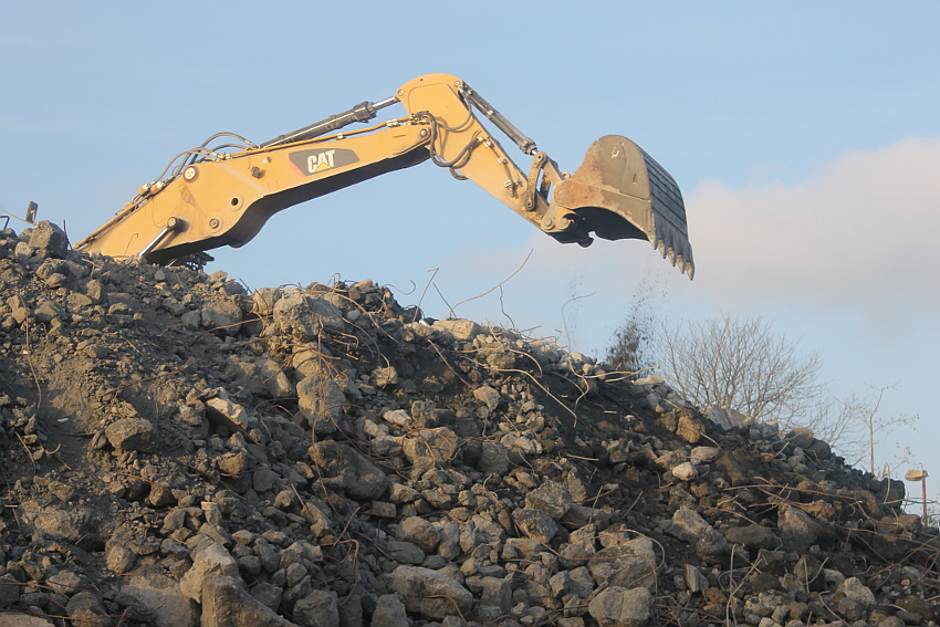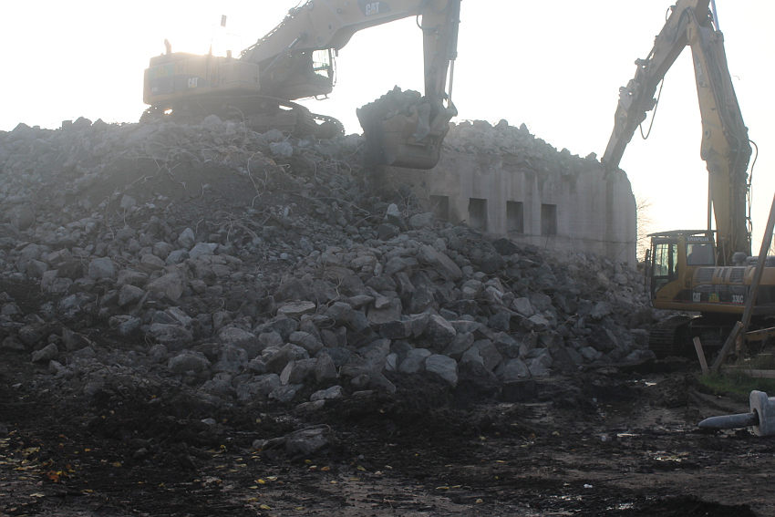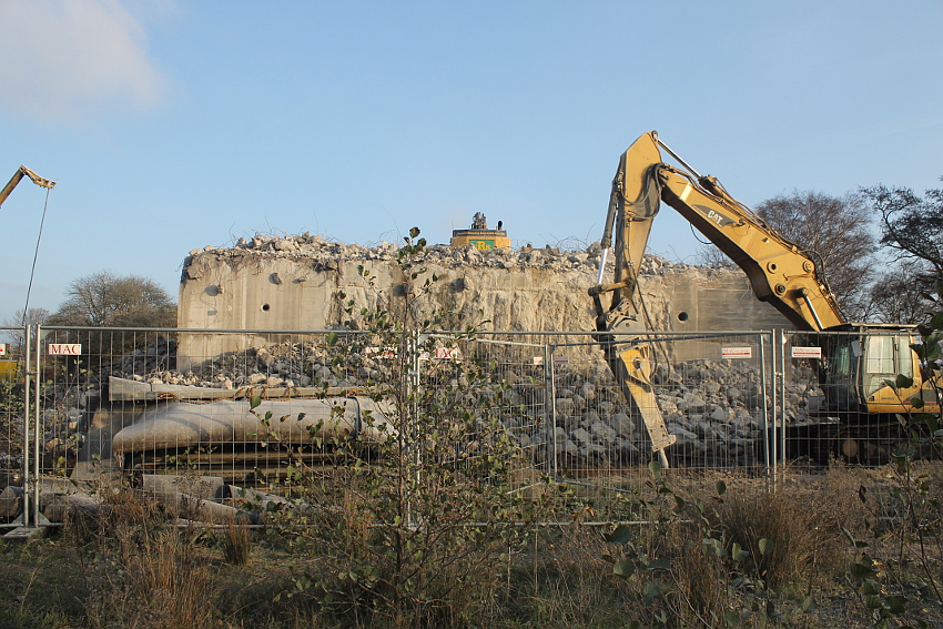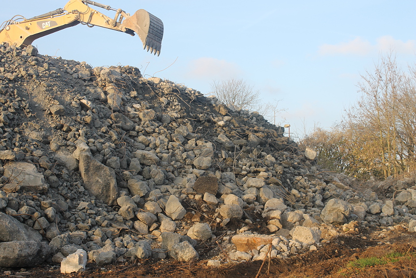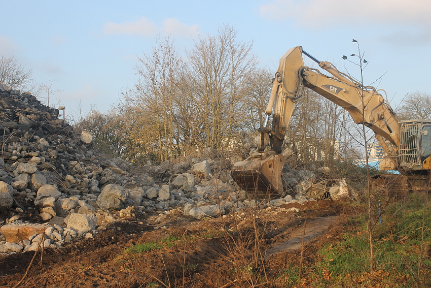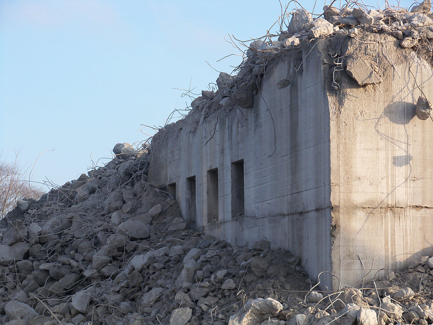 Der letzte Rest des ehemaligen OG 2 vom T 750 in dessem Südwestbereich wurde heute zerstört. Die gesamte Außenwand des OG 2 ist nunmehr Vergangenheit. Es wurde heute damit begonnen, den mittlerweile entstandenen gigantischen Schuttberg nach Osten hin zu verlagern, um an die verschütteten Teile des Bunkers zu gelangen. Eventuell soll bereits nächste Woche die "Brechmaschine" eintreffen, welche dann nach und nach den Betonschutt zerkleinert. Dafür wurde die Baustelle um rund 25 Meter nach Osten hin erweitert und auch der Bauzaun folglich weiter nach Osten versetzt.