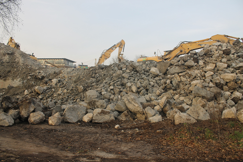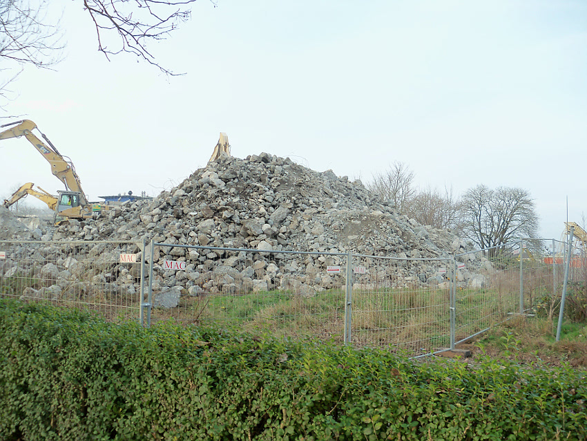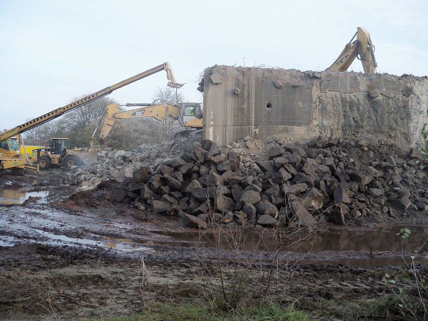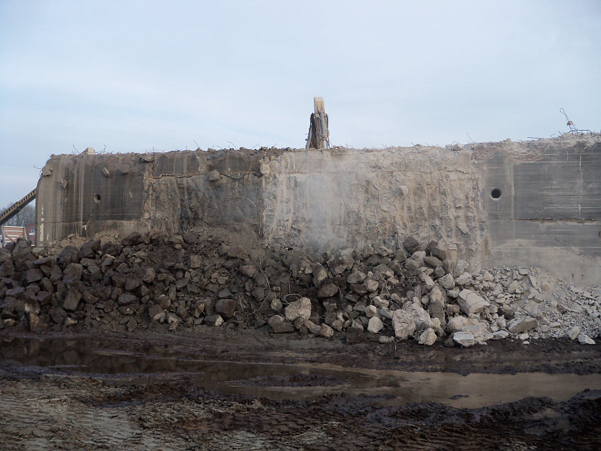 Heute wurde der Schuttberg weiter nach Osten verlagert und im Inneren des Bunkers fanden weitere Abbruchmaßnahmen mit dem Meißelwerkzeug statt. Am Schuttberg wurde verstärkt Metall aussortiert und gesondert aufgehäuft. Äußerlich hat sich am T 750-Rest im Vergleich zu gestern allerdings nur wenig verändert.