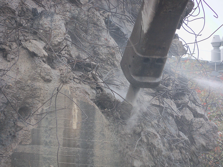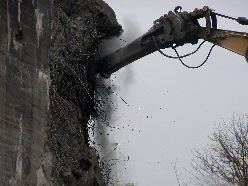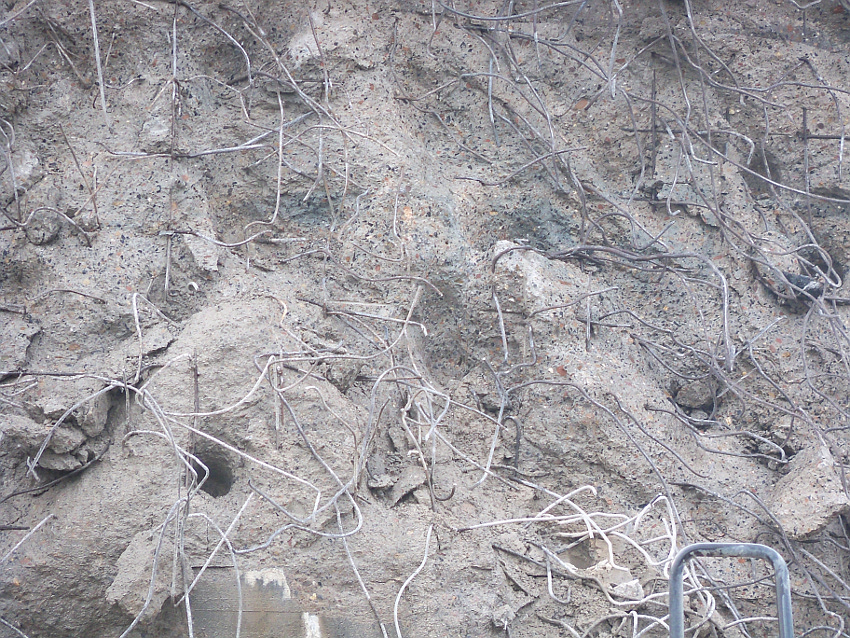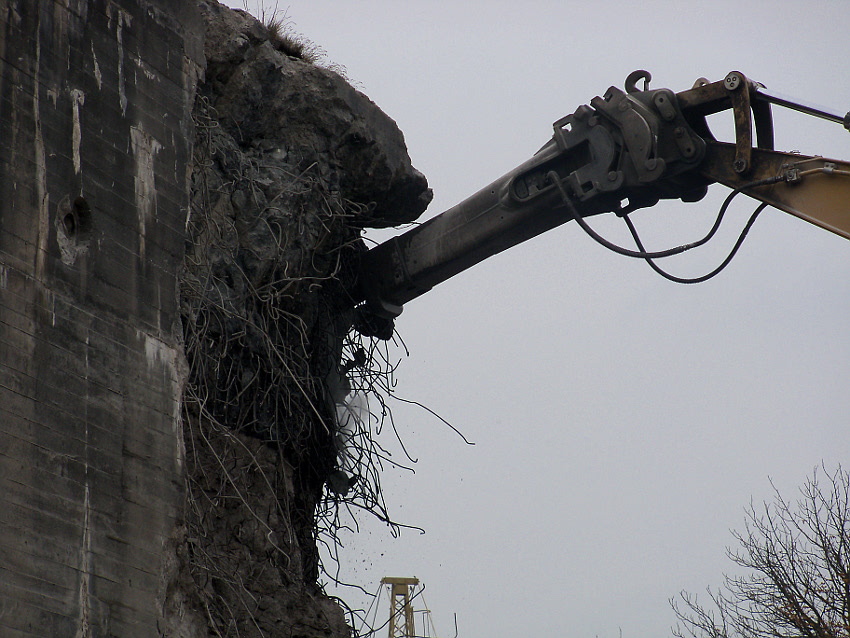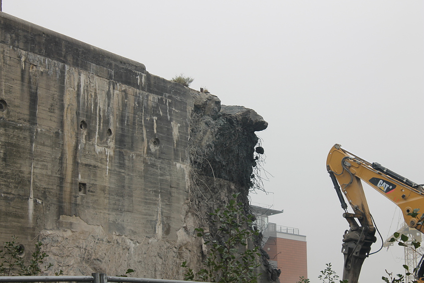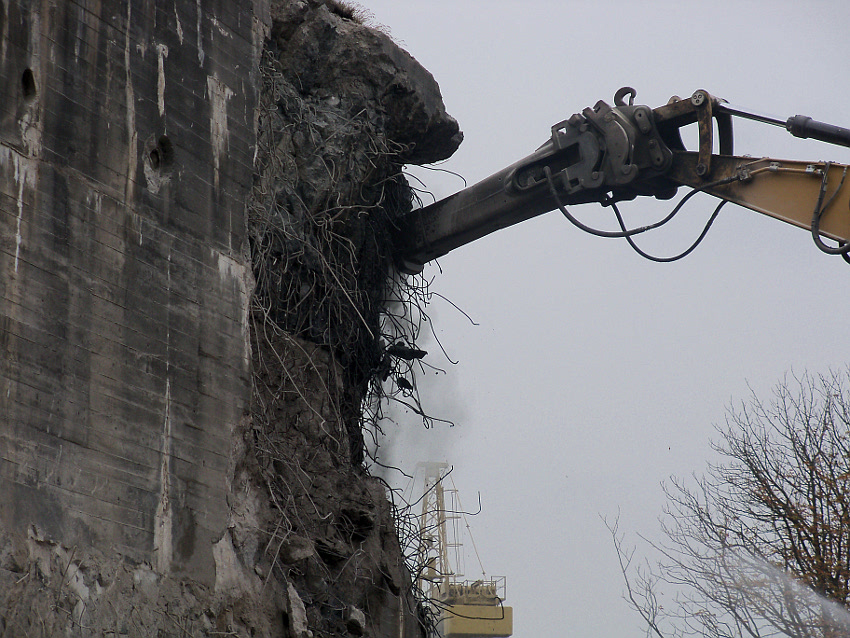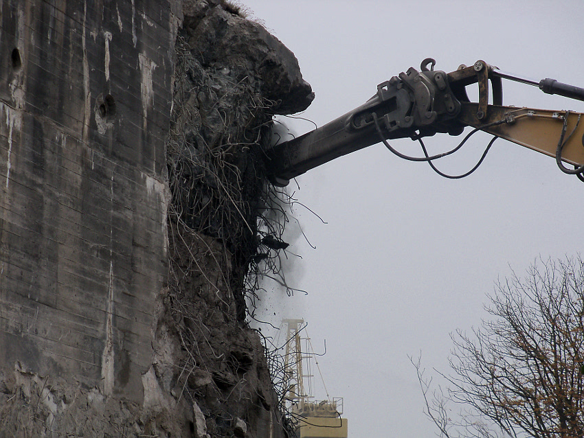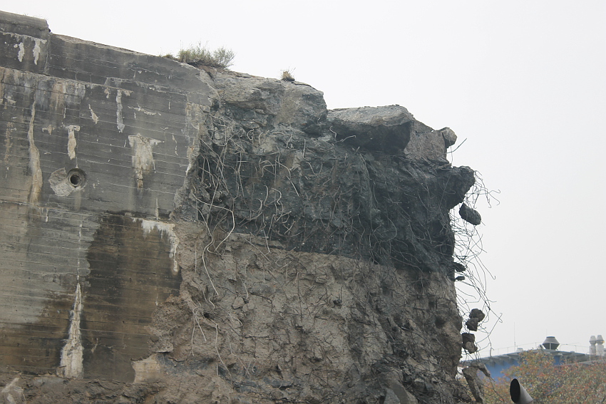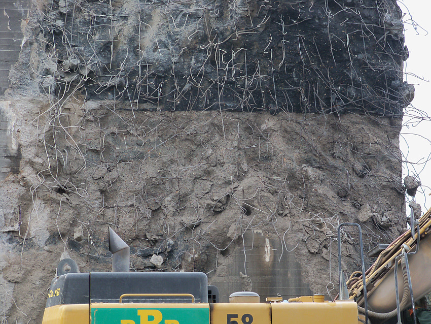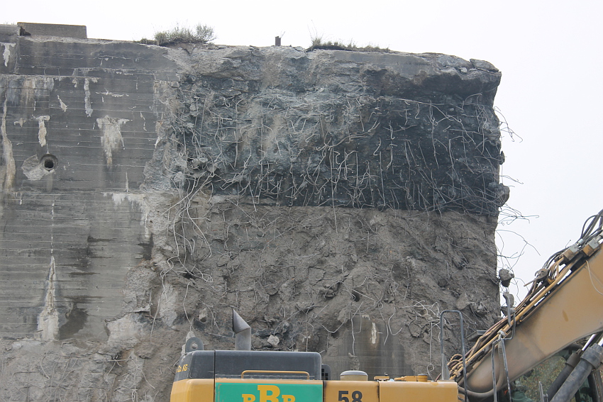 Heute wurde im Bereich der Ostwand an deren nördlichen Abschnitten weiter abgerissen. Teile der unbewehrten Deckenverstärkung fielen dabei großformatig zu Boden. Klar zu sehen ist, dass die Abschlussdecke aus "Blauem Beton" besteht. Die Außenwand im Bereich OG 2 allerdings nicht. Hier wird nach dem Gießen der Wände für die Decke eine andere Betonmischung Anwendung gefunden haben. Der Wasserspeier Nordost ist leider an dessen Oberseite stark beschädigt worden beim Aufprall. Er liegt kopfüber mittlerweile unter Trümmerschutt begraben...