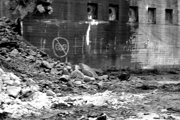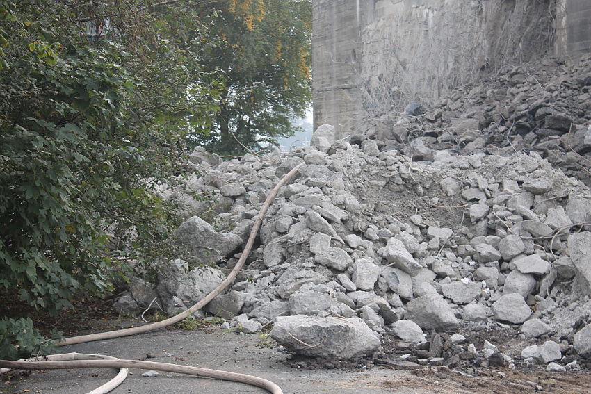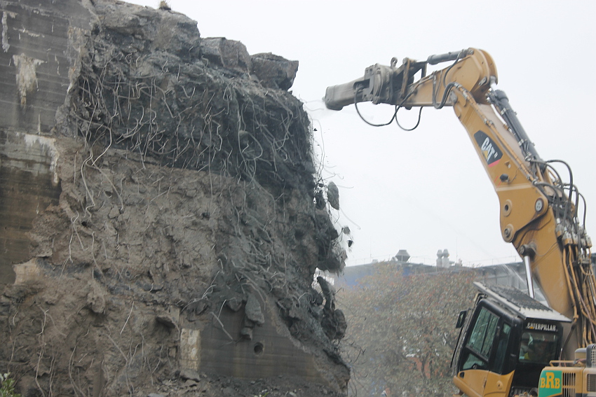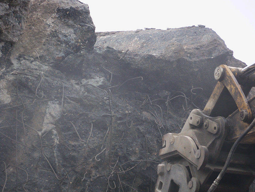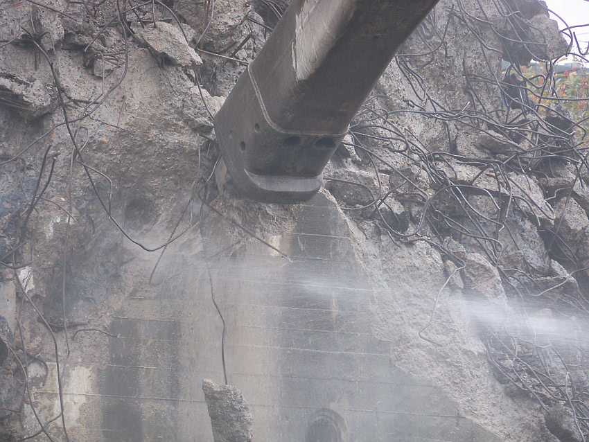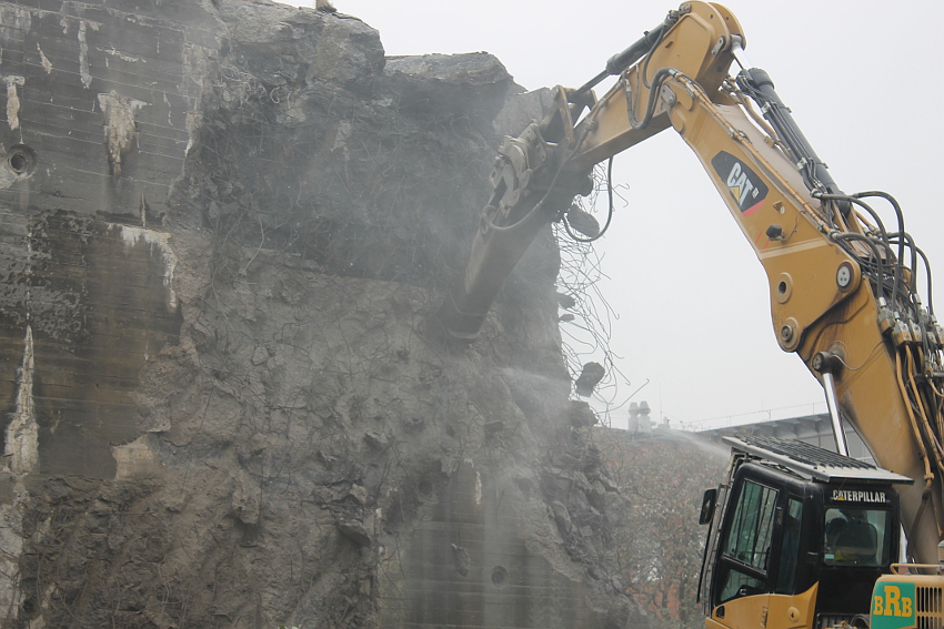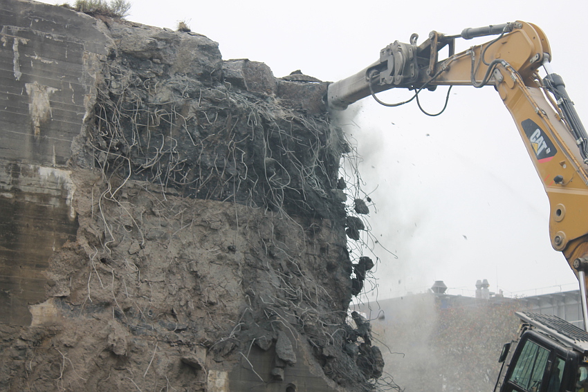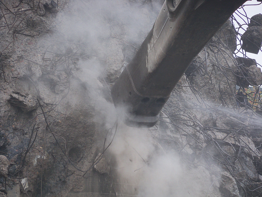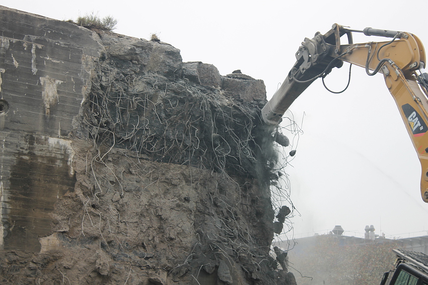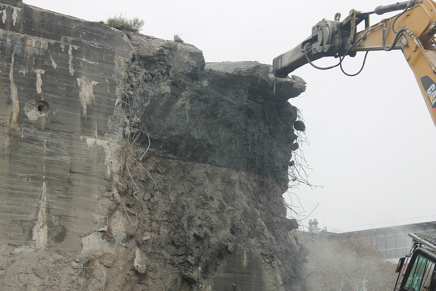 Heute wurde im Bereich der Ostwand an deren nördlichen Abschnitten weiter abgerissen. Teile der unbewehrten Deckenverstärkung fielen dabei großformatig zu Boden. Klar zu sehen ist, dass die Abschlussdecke aus "Blauem Beton" besteht. Die Außenwand im Bereich OG 2 allerdings nicht. Hier wird nach dem Gießen der Wände für die Decke eine andere Betonmischung Anwendung gefunden haben. Der Wasserspeier Nordost ist leider an dessen Oberseite stark beschädigt worden beim Aufprall. Er liegt kopfüber mittlerweile unter Trümmerschutt begraben...