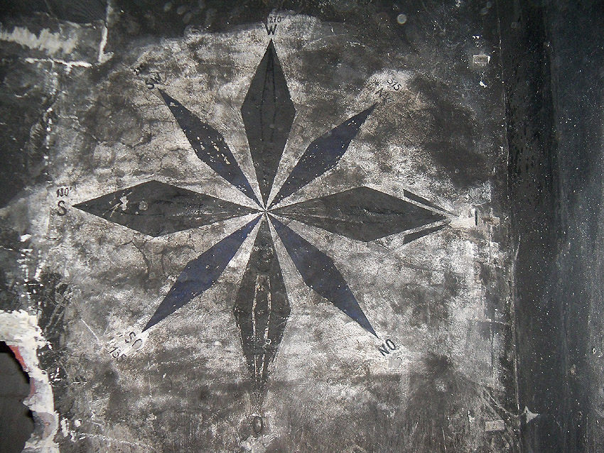 - T 750 Hannoversche Straße 2 in Wilhelmshaven: Auch in diesem Bunker ist wie im TROTZ, BANTER RUINE und U-BUNKER eine Windrose im Inneren, hier jedoch an eine Wand statt an eine Decke, gemalt worden. Die im Krieg von einem wohl im T 750 stationierten Marinesoldaten unter dem Treppenaufgang des Westtreppenhauses angemalte Windrose konnte ansatzweise vom Ruß gereinigt werden. Hier im Erdgeschoss hat es durch Vandalismus vor einigen Jahren gebrannt. Durch die Reinigung ist ersichtlich, dass die Malerei in Blau-Schwarz gehalten ist. Das Blau entspricht dem gleichen Farbton anderer Schriften im Bunker. Wer hat die Windrose gemalt?