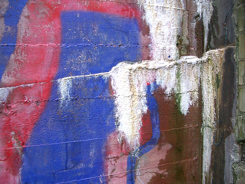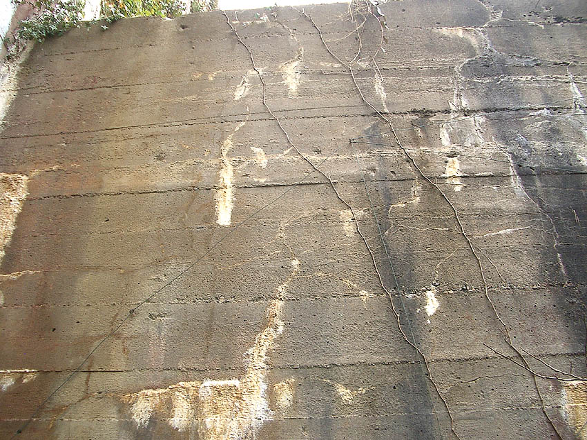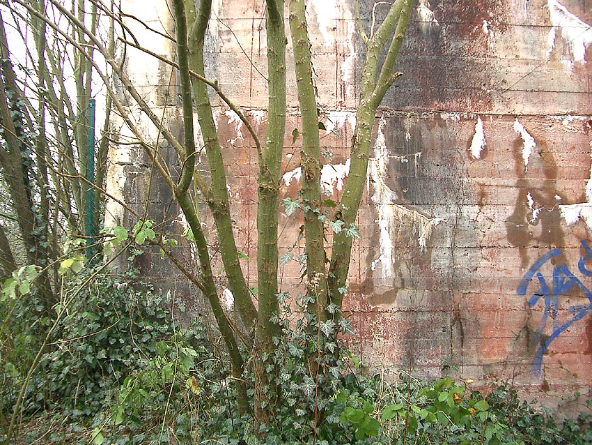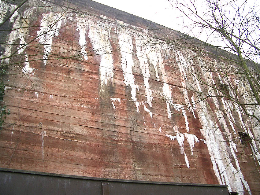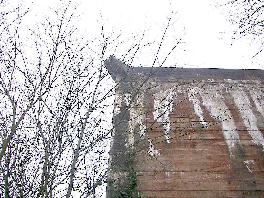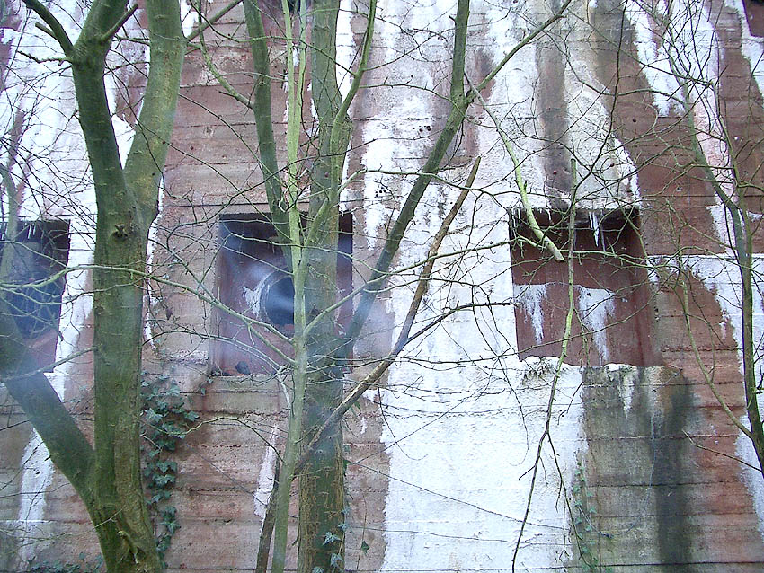 Zusätzlich war am westlichen T 750 an der Westwand über dem Splitterschutzvorbau in großer heller Schrift „JACHMANN“ angemalt worden. Der Schriftzug verblasste nach dem Krieg äußerst schnell wieder. Zu sehen ist zudem, dass der Bunker bereits im Krieg kurz nach Fertigstellung erste starke Ausblühungsstellen aufwies.