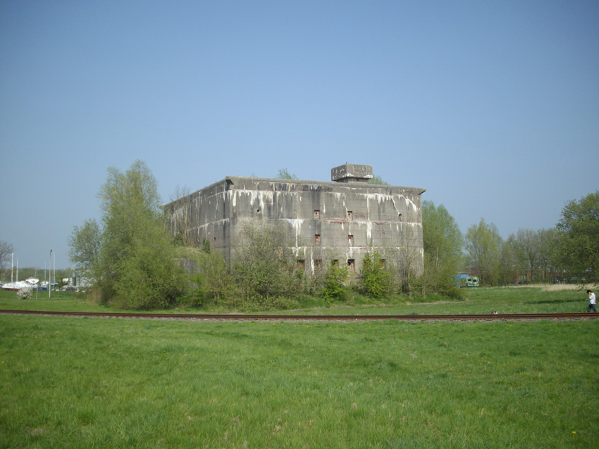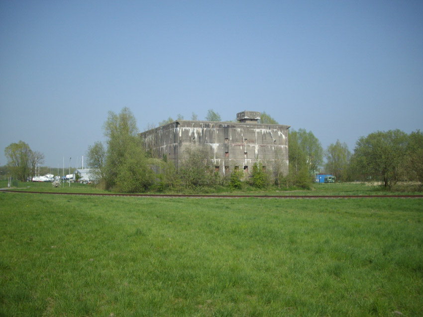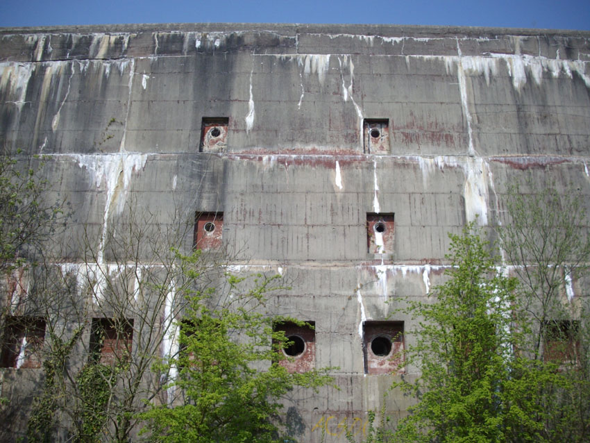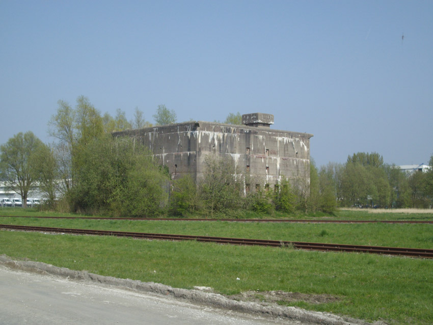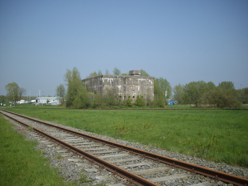 Der am Bunker im Unterbereich erkennbare helle Schriftzug stammt aus der Nachkriegszeit. Was dort stand, ist noch unklar. Im Vordergrund das Betonfundamentfeld der nicht realisierten Halle des Projektes Nordwerft westlich der heutigen Celler Straße.