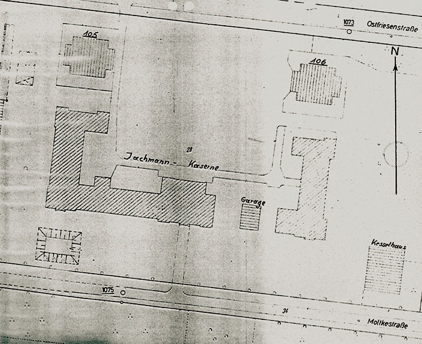 1945: Mittig rechts im Bild hinter dem Kasernengebäude zu sehen der Truppenbunker. Wie auch der Westbunker wird er eine helle Aufschrift an der Westwand an gleicher Stelle besessen haben. Hier gut zu sehen das höchstwahrscheinliche Schriftfeld über dem West-Splitterschutzvorbau. Es wird aber nach dem Krieg schnell wieder verblasst sein. Die Frage ist, was dort stand. "Jachmann" / "Scharnhorst" / "Gneisenau"...?