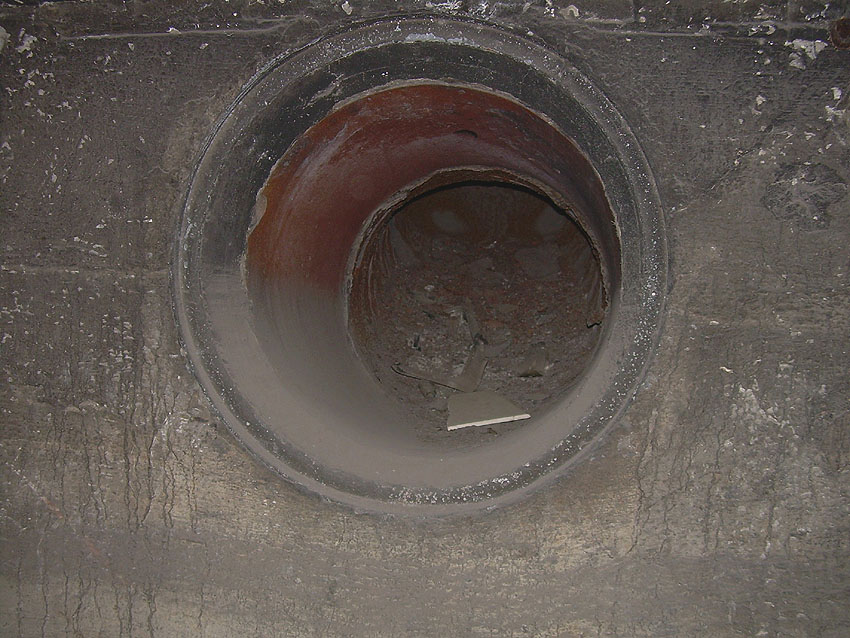 Einer der großen Luftschächte im Splitterschutzvorbau. In Wilhelmshaven sind hier Stahlsiebgitter nachgewiesen, welche vor die insgesamt vier Schächte am Bunker mit einem Halterungsring angeschraubt wurden. Bohrungen für Schrauben eines Gitterkranzes sind bei diesem Schacht nicht erkennbar.