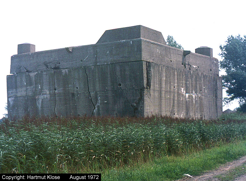 Andere Quellen sagen, der Bunker sei bereits 1946 gesprengt worden, er wurde erst sehr spät im Krieg gebaut und nicht fertig gestellt. Die Aufsätze sollten alle drei für leichte Flak vorgesehen gewesen sein. Die erste Sprengung soll nicht den Erfolg gehabt haben, der beabsichtigt wurde. Darauf hin wurden die Gründungspfähle gesprengt, worauf der Bunker innerhalb einer Woche (!) circa 7 Meter (?) in das Erdreich versackt sein soll...