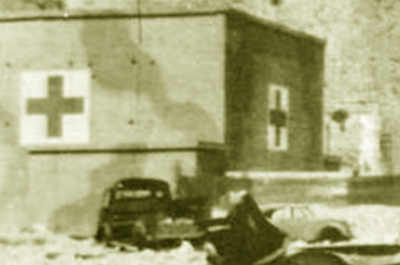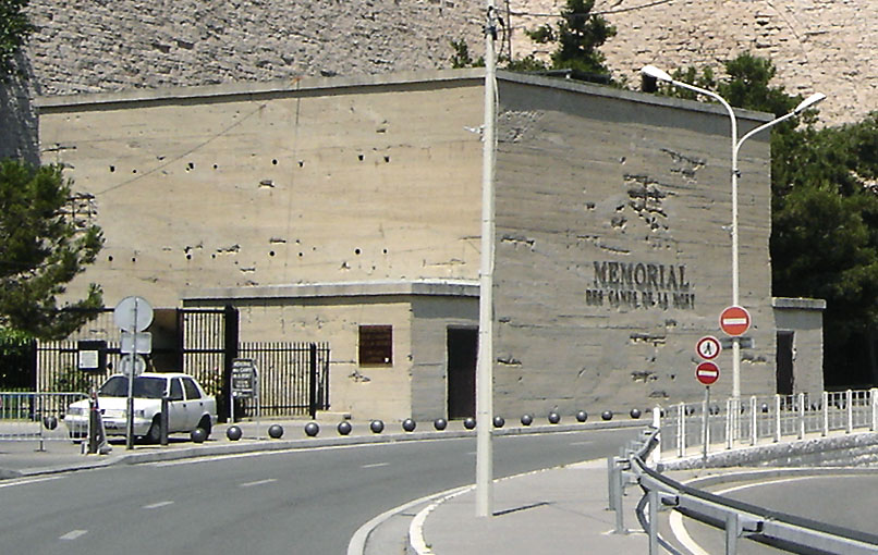 Bild unmittelbar nach der alliierten Besetzung Marseilles. Links neben dem Splitterschutzvorbau befindet sich heute eine Türöffnung, die hier jedoch noch nicht vorhanden ist. Interessant sind die auffallenden Roten Kreuze am Bunker und die dazu im Widerspruch stehende Feldtarnbemalung in mediterranen Farbtönen. Die Kreuze werden erst spät angebracht worden sein, als es wichtiger war, den Bunker als Lazarett zu kennzeichnen, um gezielte Angriffe abzuwenden. Eine Tarnbemalung des Bunkers, der nach Westen, Norden und Süden ohnehin eingebettet im Sichtschatten des Forts liegt, war nicht mehr prioritär.