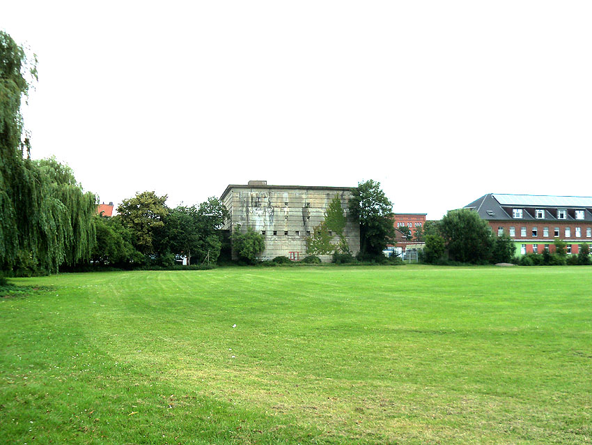 Der Bunker ist äußerlich relativ gut erhalten. Er ist jedoch circa 1,00 m höher als "normal" angelegt. Seine Zugangsbauwerke sind deshalb über Treppen erreichbar (ähnlich wie beim "Scharnhorstbunker" in Kiel). Warum diese erhöhte Bauweise erfolgte, ist mir noch nicht bekannt. Es könnte eventuell sein, dass das Objekt über ein viertes halbkellerartiges ( 3,5 Stockwerke...) Geschoss verfügte. Sozusagen Ebene "0". Ich halte dies aber für ziemlich ausgeschlossen. Der Bunker wurde von innen gesprengt, Teile des Treppenhauses sind jedoch noch begehbar. Von der Sprengung zeugen die vielen kleinen Risse an der Fassade. Auffallend sind die kerbenartigen Streifen / Vertiefungen an den Außenwänden des Bunkers. Siehe dazu auch:
