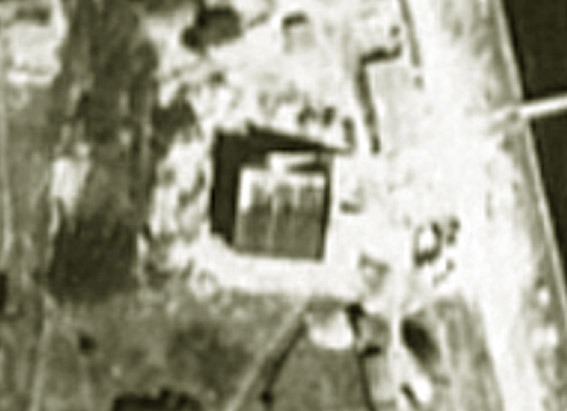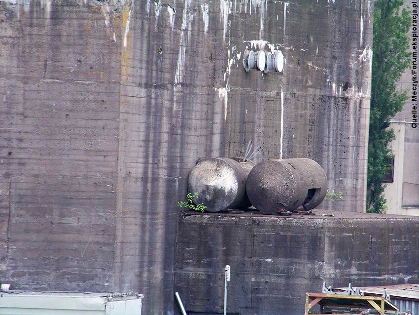 Links auf dem Splitterschutzvorbau sind die beiden abgelagerten Splitterschutzzellen erkennbar.