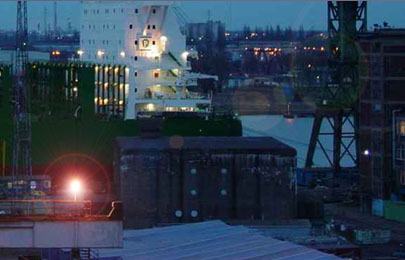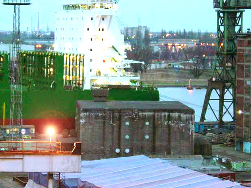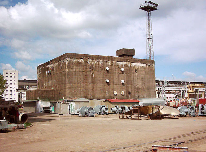 T 750 Hafeninsel Südost (Danziger Schichau-Werft). Dieser Bunker besitzt aufgrund der Errichtung in zweiter Bauphase keinerlei Luftschachtvertiefungen an seinen Außenwänden. Das Luftschachtmuster entspricht im Grunde dem eines "normalen" T 750 erster Bauphase. Beachtenswert sind die Blenden, welche nachträglich vor die meisten Luftschächte gesetzt wurden. Auf dem Dach des nördlichen Schutzvorbaues liegen noch heute zwei Splitterschutzzellen unbekannter Bauart (!). Da überall im Werftgelände DYWIDAG-Zellen aufgestellt wurden, könnte es sich hier jedoch eventuell ebenfalls um Zellen dieser Bauart handeln. Ähnlichkeit zumindest ist vorhanden.