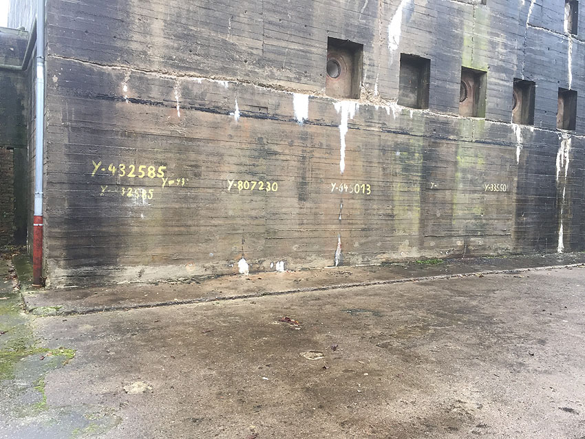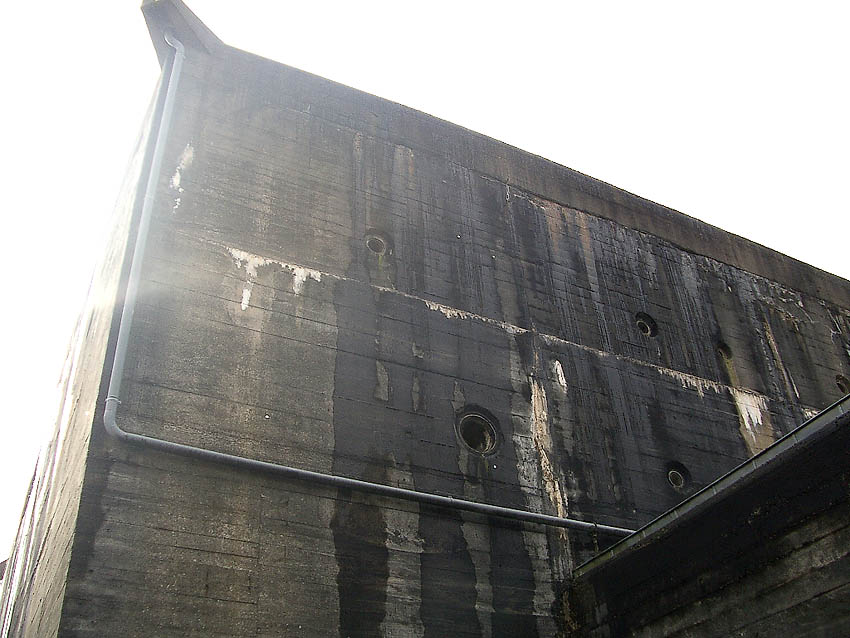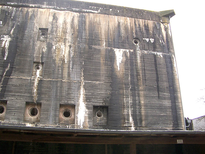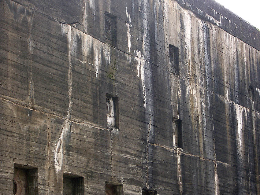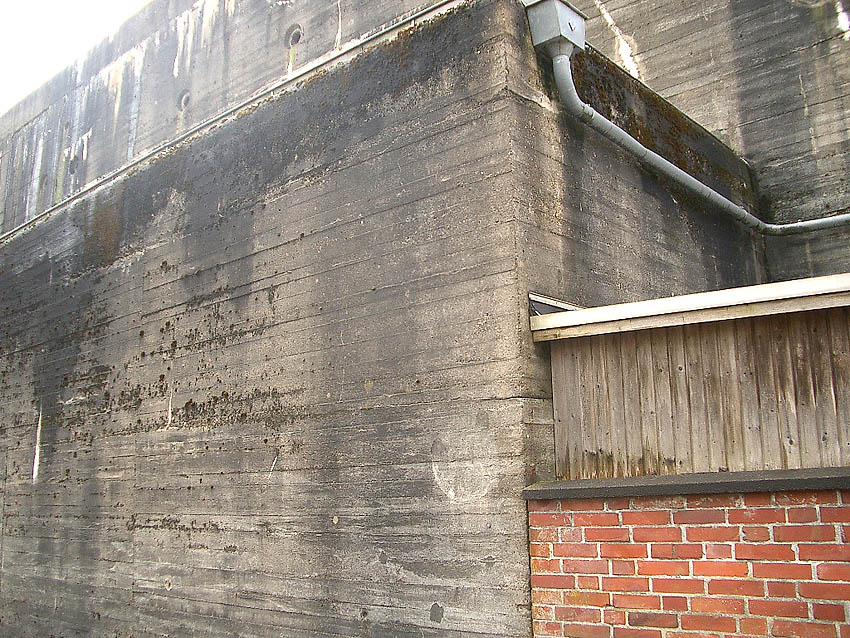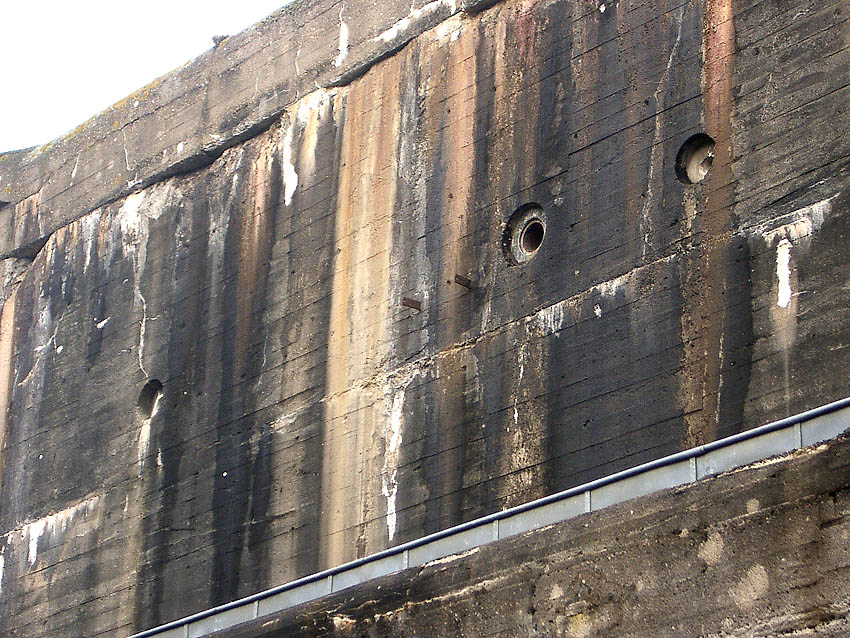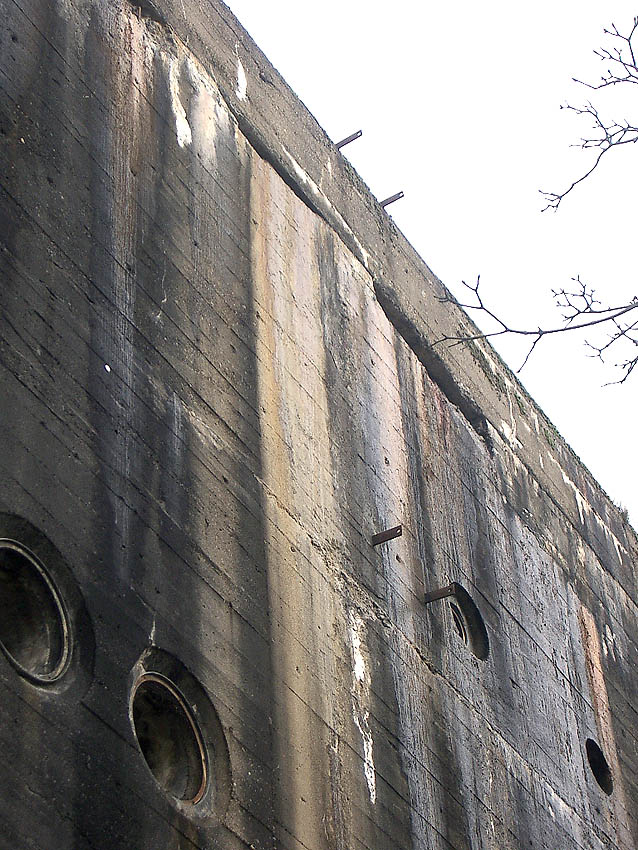 Nachfolgend Bilder des Bunker-Ostbereiches vom Mai 2018. Sie zeigen unter anderem Aufnahmepunkte, eventuell (ursprünglich) mit innenliegenden Ösen versehen (?) auf / in der Zerschellerplatte. Sollten so die Platten eventuell (bei Teilzerstörung durch Bombeneinschlag zum Auswechseln) angehoben werden? Auch zu sehen unter anderem Kernbohrungen in der Wand aus der Zeit um 2005. Immer noch stellt sich auch die Frage: War der Bunker tarnbemalt? Wenn, dann ziegelrot oder mattschwarz? Eventuell sogar ziegelrot UND mattschwarz? Es sind sowohl rote, als auch schwarze Stellen überall am Bunker noch schwach vereinzelt zu sehen.