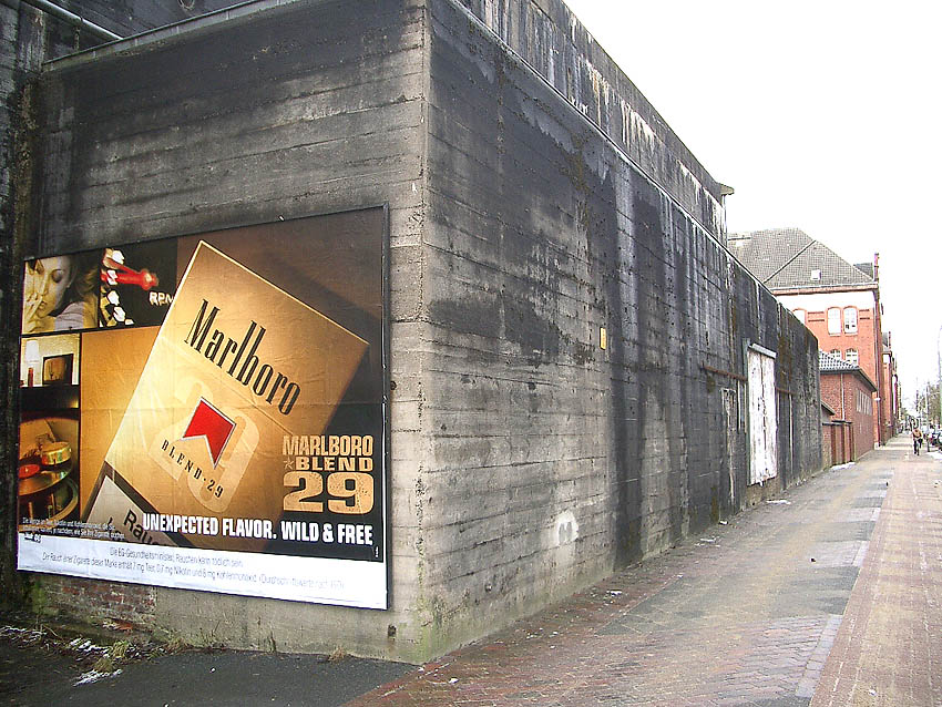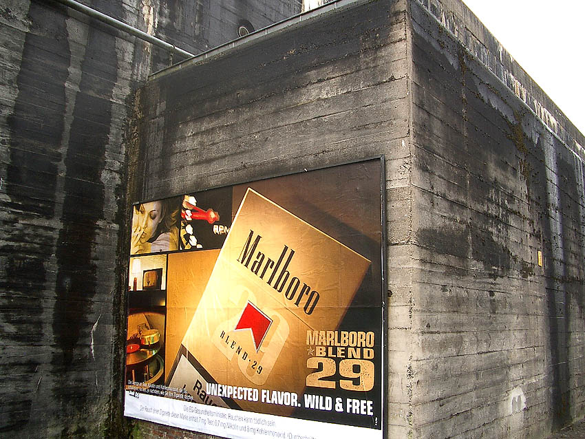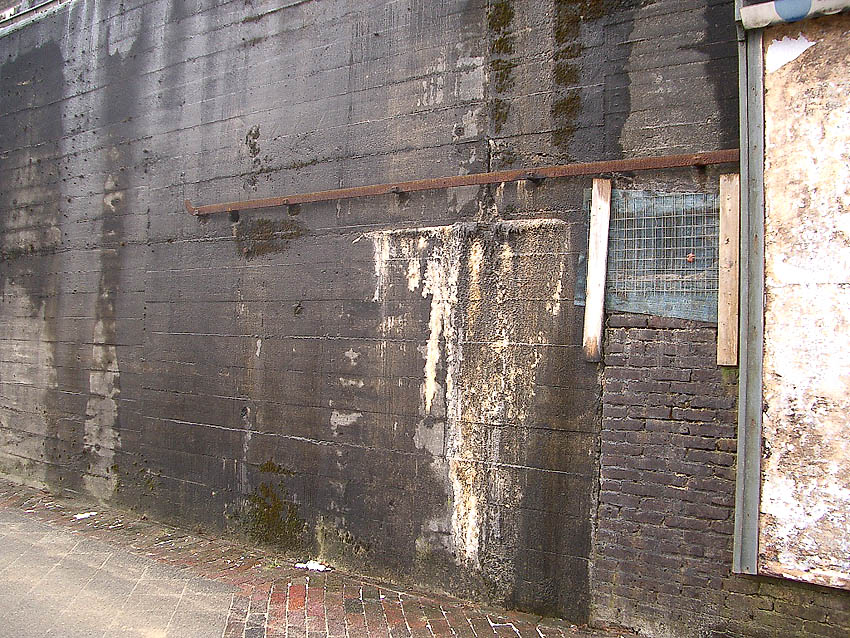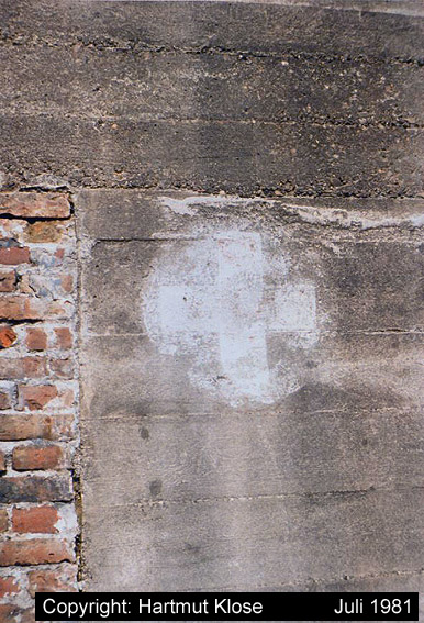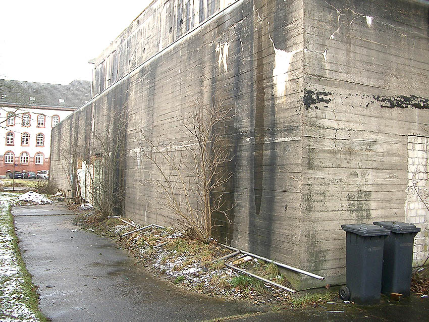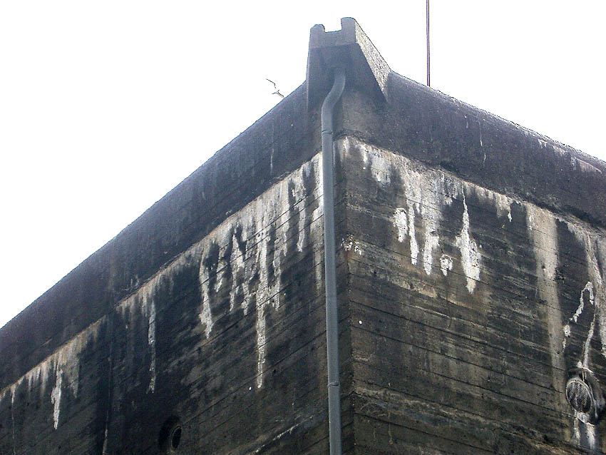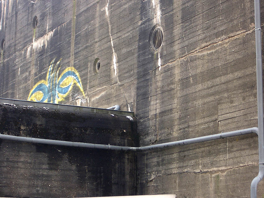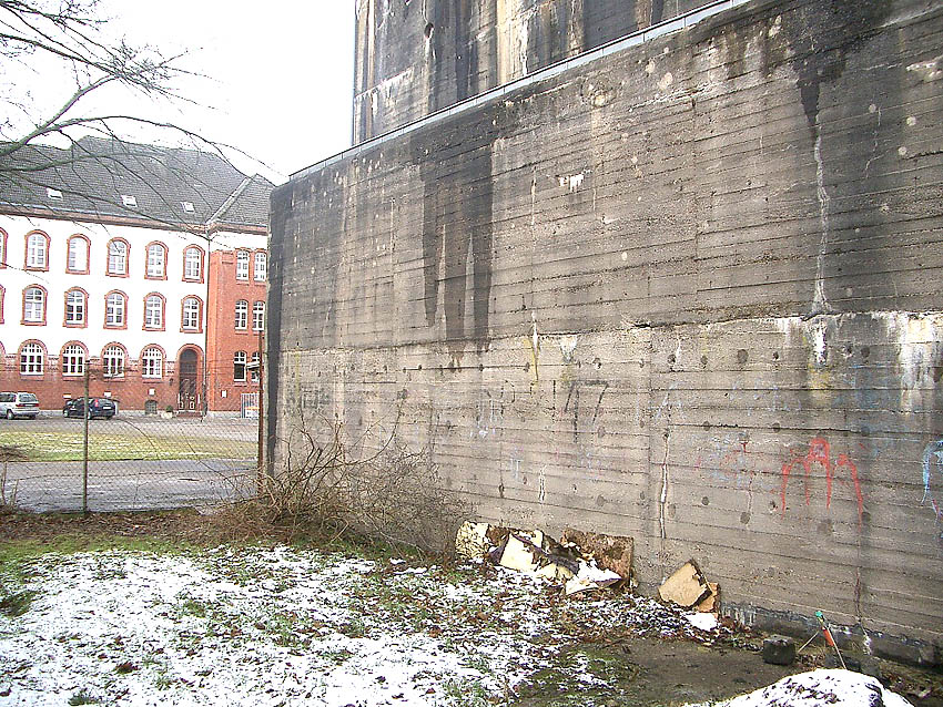 Südwand: Hier ist ein mutmaßlicher Schriftzug zu erkennen. Es könnte sich dabei um "Lumpen- und Trödelhandel im Bunker Trotz" gehandelt haben. Nach dem Krieg war im Bunker nachweisbar ein Trödelhandel ansässig, ein dementsprechender Schriftzug soll sich am Bunker befunden haben. Wenn es sich hier um einen Schriftzug handelte, so ist er jedoch schnell wieder verwaschen.