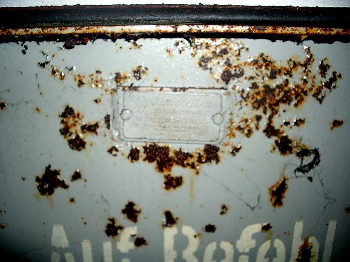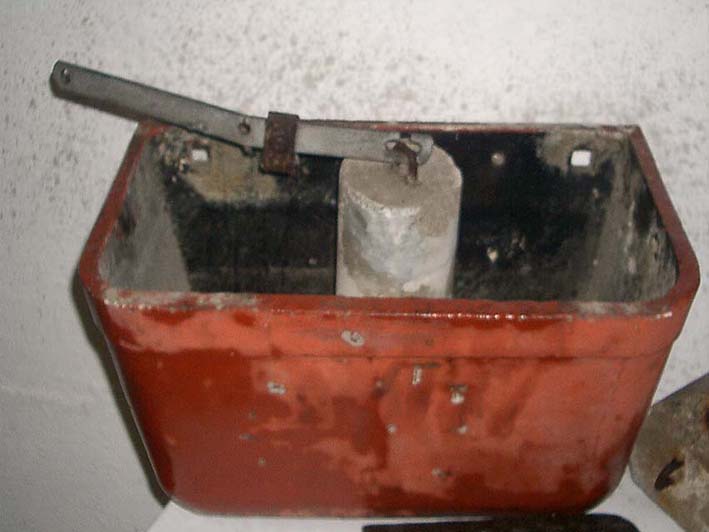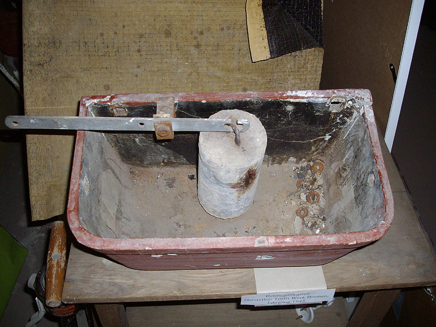 Die Spülkästen der Aborte in fast allen Truppenmannschaftsbunkern waren nicht aus Metall, sondern aus Beton. Pro Spülbeckenkasten ergab sich ein Gewicht von circa 10 Kilogramm. Die Becken waren sehr empfindlich. Sie waren schocksicher aufgehangen. Auf deren Seitenwandung befand sich ursprünglich jeweils ein Papieraufkleber mit der Beschriftung: