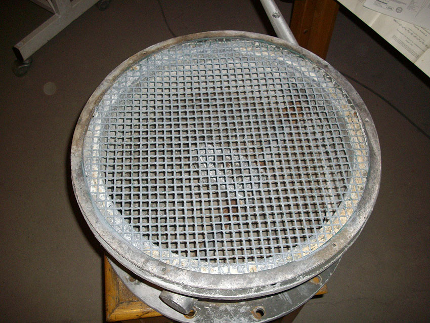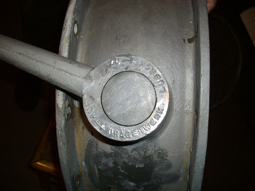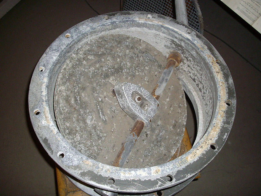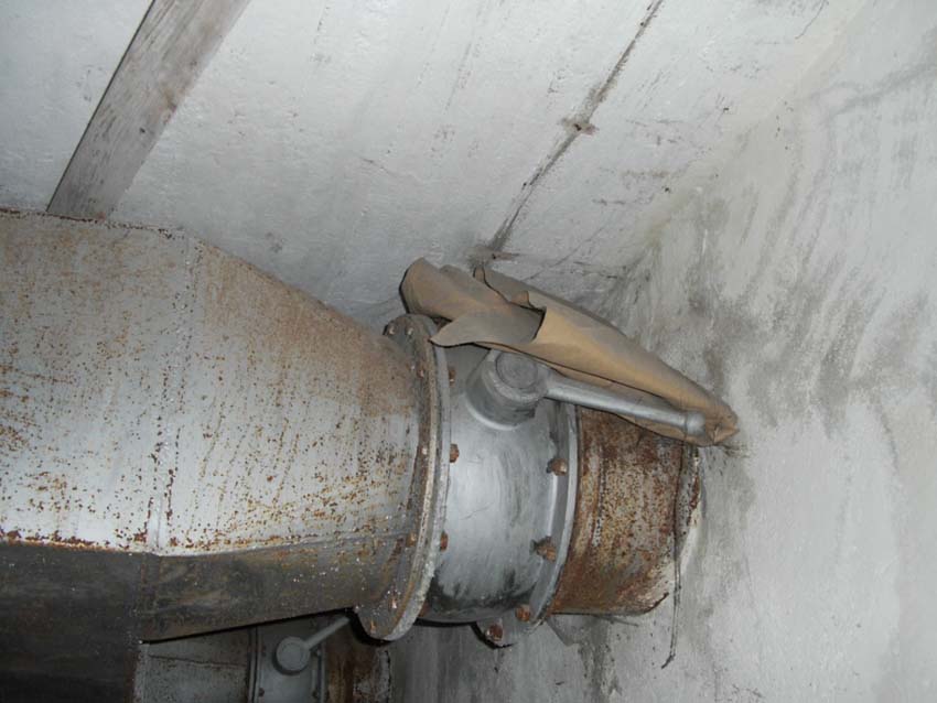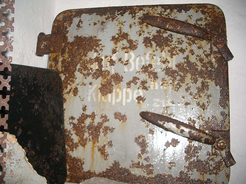 In den Truppenmannschaftsbunkern befanden sich meist zwei Arten von Druckschutzklappen vor den inneren Lüftungsschachtmündungen. Die kleinere Version für die Schächte mit geringerem Querschnitt, sowie nicht ganz so häufig wie die kleinere Version im Bunker vertreten die größere Version für die Lüftungsschächte mit großem Querschnitt. Hergestellt wurden die Klappen meist durch die Stahlbaufirma Klement und Sohn. Hier abgebildet ist eine der größeren Schutzklappen.