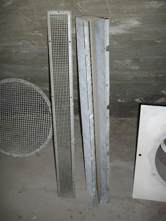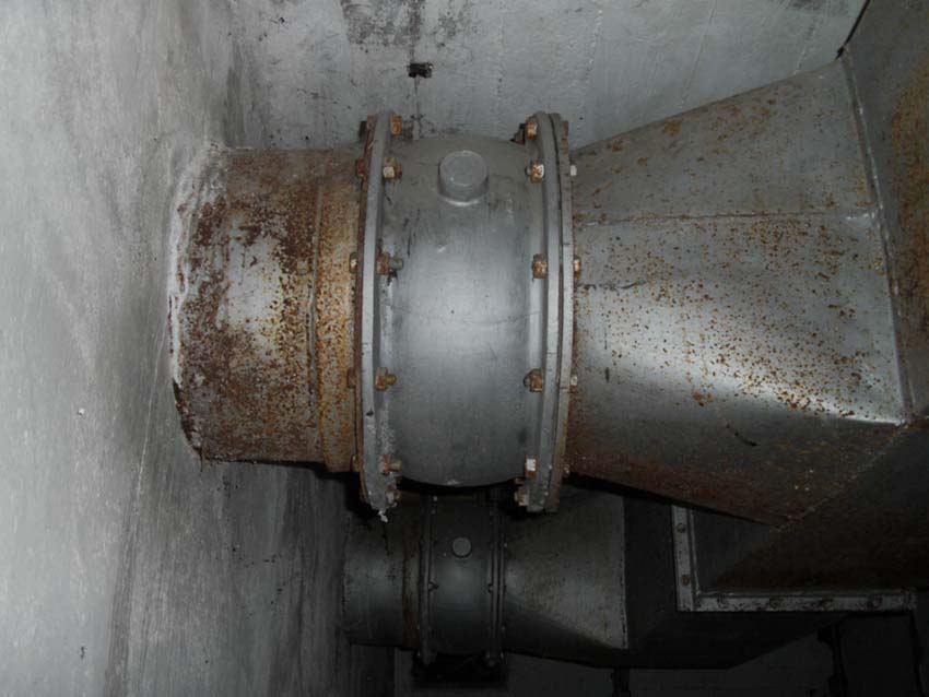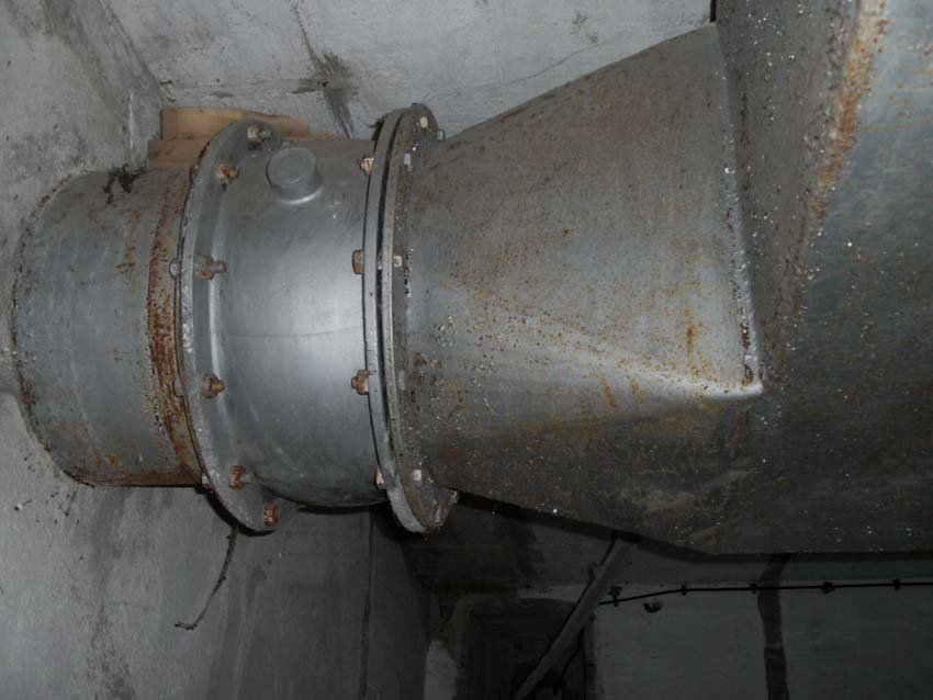 Die bekannten drei großen Lüftungsschächte an den Stirnseiten der Ebene 1 des Truppenmannschaftsbunkers leiteten sich innen fort. Zunächst folgte ein schließbares Druckventil, danach setzte sich jeweils ein eckiger Metallschacht an der Decke ins Bunkerinnere weiter fort.