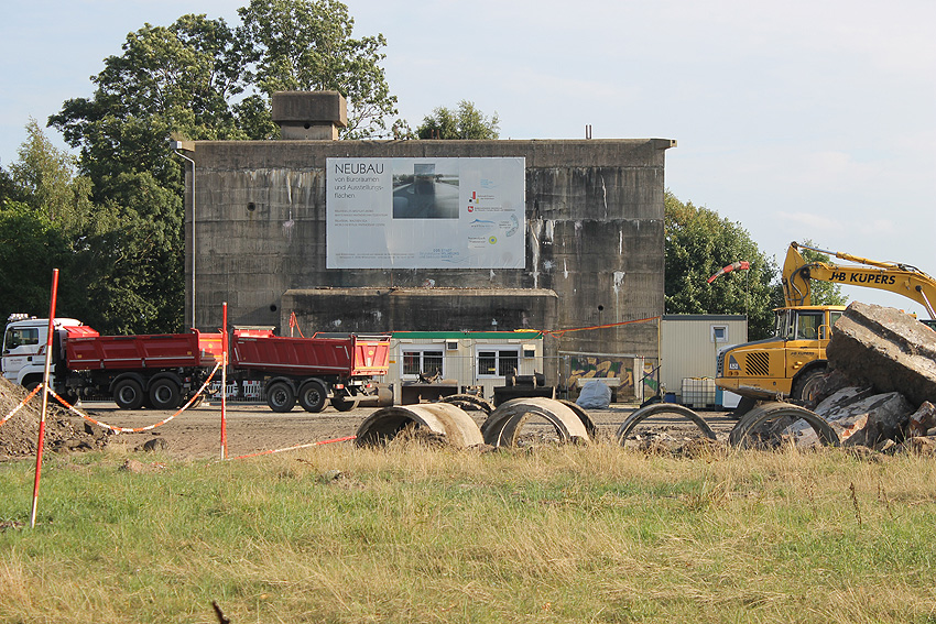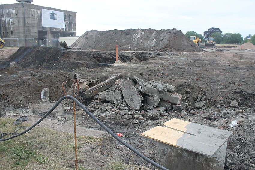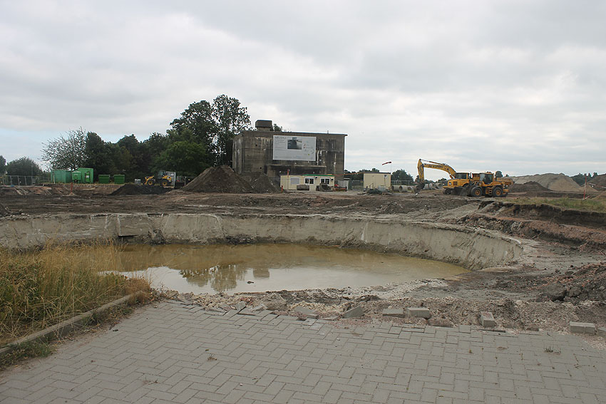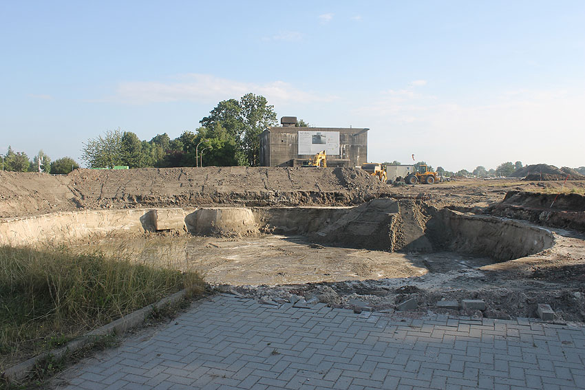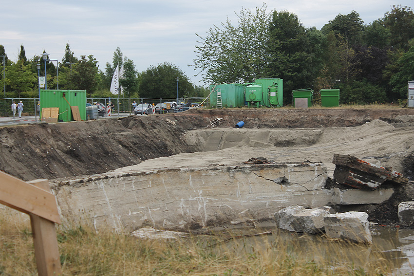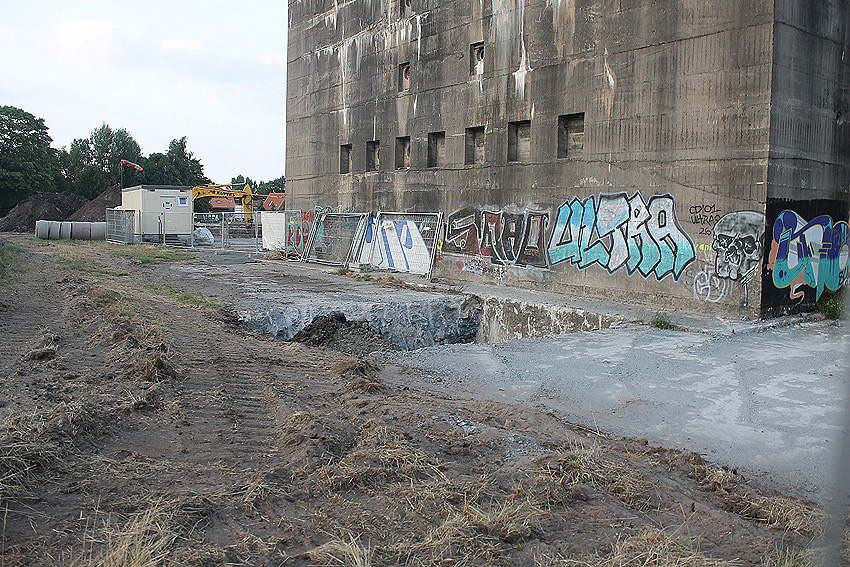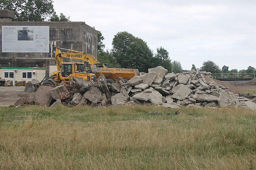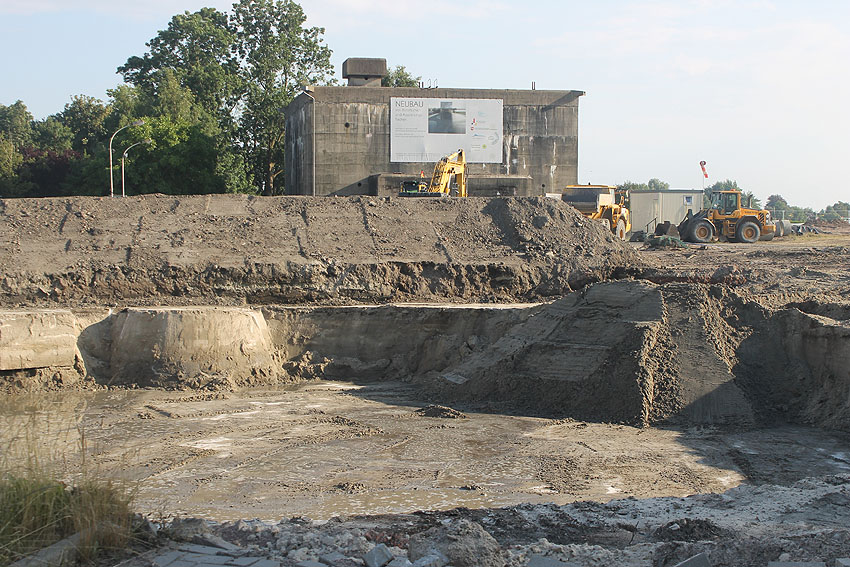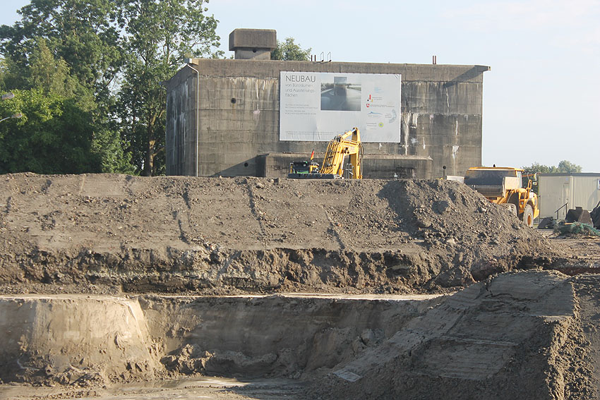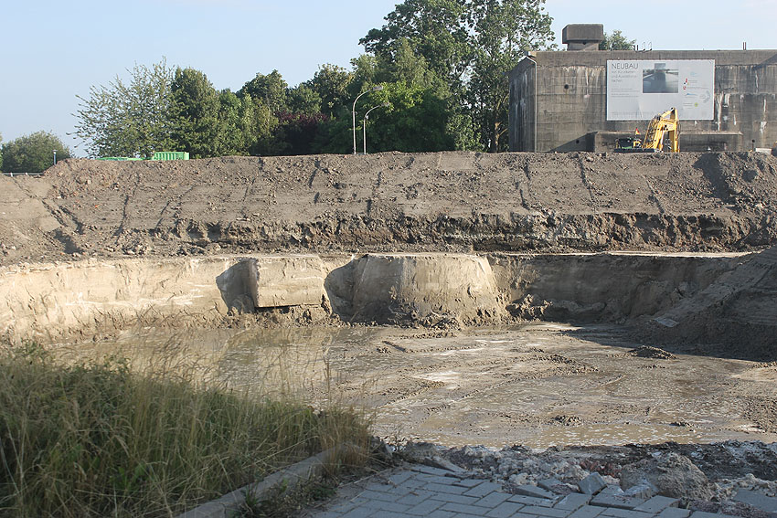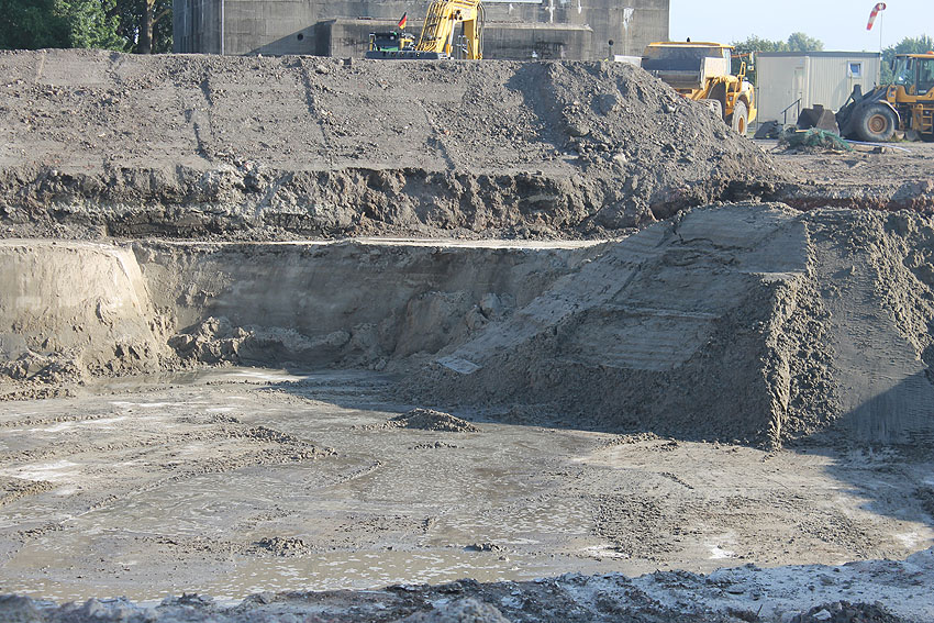 Im westlichen Bereich der Zerschellerplatte des T 750 wurde ein Teilstück weggebrochen und ein "Tunnel" bis etwa einen Meter unter das eigentliche Bunkerfundament getrieben. Hiermit sollte festgestellt werden, auf wieviel Pfählen der Bunker gegründet ist. Die Freilegung von zwei Pfählen reichte dafür wohl zur Berechnung aus. Die Maßnahme soll nach unseren Informationen nötig gewesen sein, um Statikwerte bezüglich des geplanten Überbaues des T 750 zu berechnen. Nach etwa einer Woche wurde die Öffnung dann wieder verfüllt und die zerstörte Zerschellerplatte in dem Bereich neu mit Betonschlemme ausgefüllt. Die eigentlichen Sanierungsarbeiten auf dem Gelände "wandern" nun weiter in Richtung Westen in etwa abschließend mit der westlichen Bunkerwand. Im Oktober sollen die Arbeiten abgeschlossen sein. Auch die verbliebene Fundament-Sohlplatte des Öltanks "Grodenfähre Nord" wurde mittlerweile zerkleinert und abgetragen.