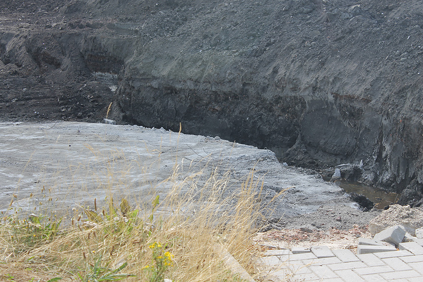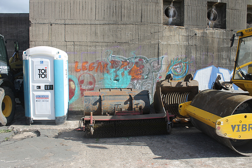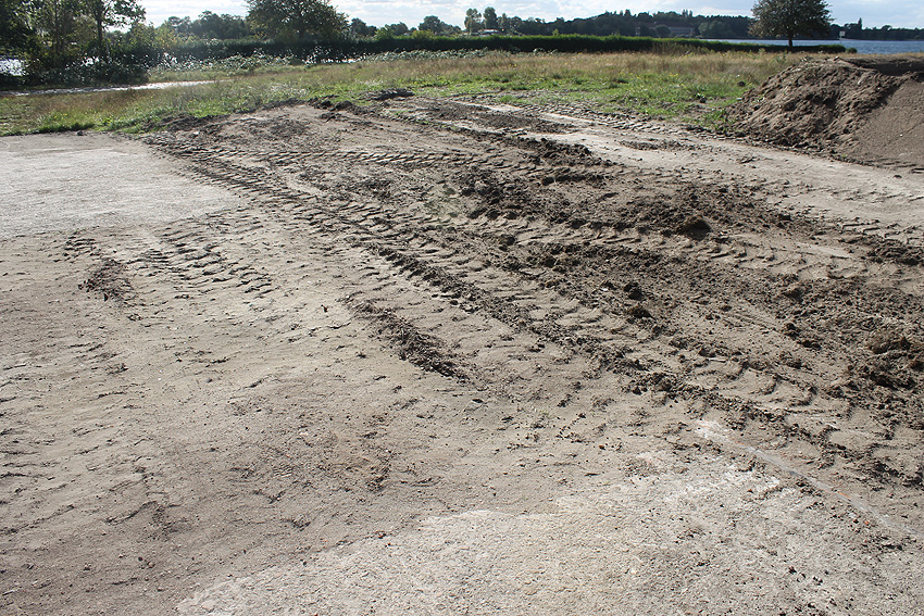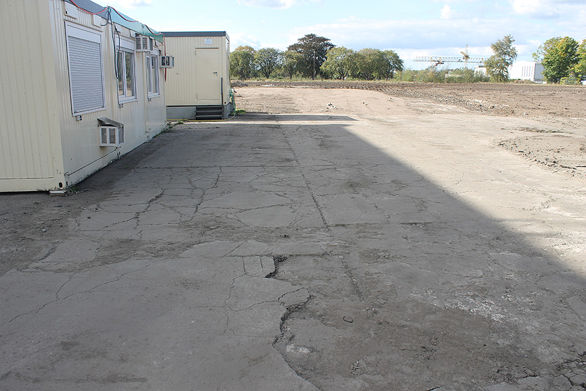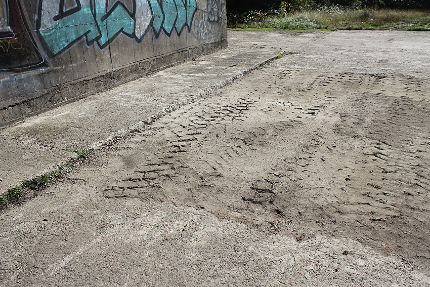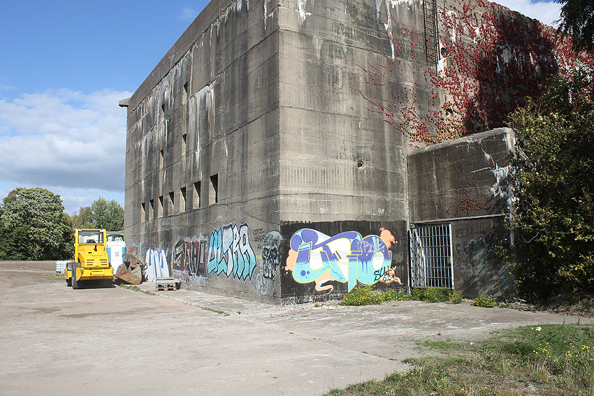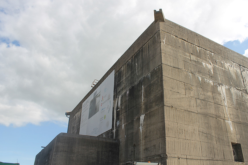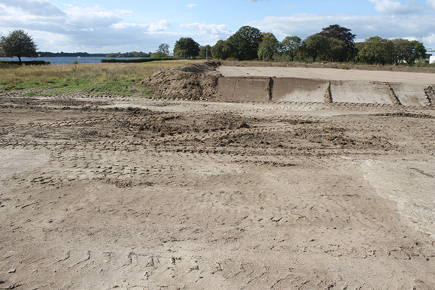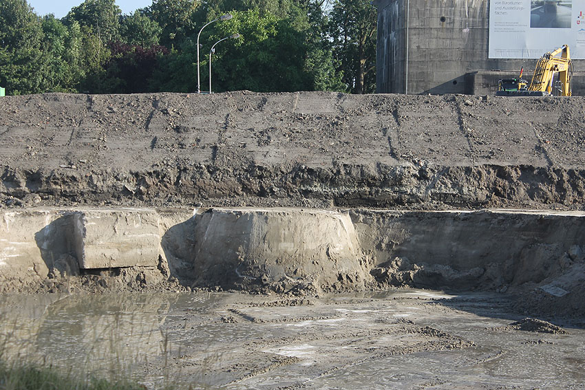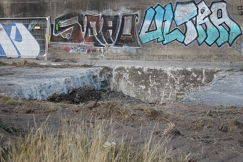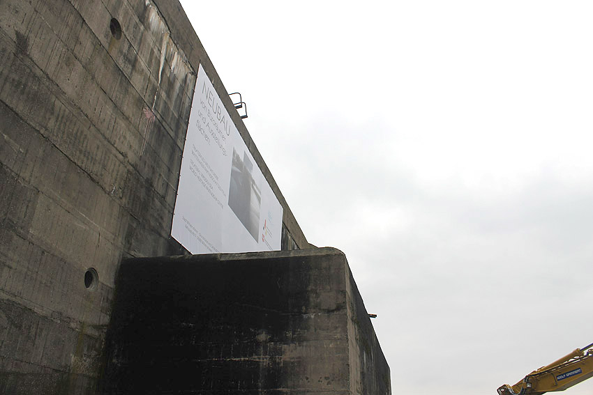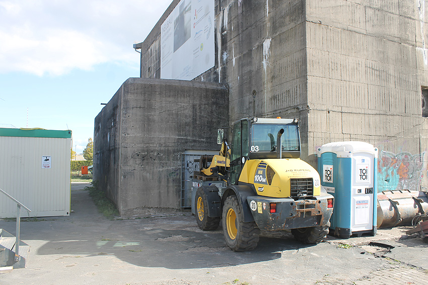 Im westlichen Bereich der Zerschellerplatte des T 750 wurde ein Teilstück weggebrochen und ein "Tunnel" bis etwa einen Meter unter das eigentliche Bunkerfundament getrieben. Hiermit sollte festgestellt werden, auf wieviel Pfählen der Bunker gegründet ist. Die Freilegung von zwei Pfählen reichte dafür wohl zur Berechnung aus. Die Maßnahme soll nach unseren Informationen nötig gewesen sein, um Statikwerte bezüglich des geplanten Überbaues des T 750 zu berechnen. Nach etwa einer Woche wurde die Öffnung dann wieder verfüllt und die zerstörte Zerschellerplatte in dem Bereich neu mit Betonschlemme ausgefüllt. Die eigentlichen Sanierungsarbeiten auf dem Gelände "wandern" nun weiter in Richtung Westen in etwa abschließend mit der westlichen Bunkerwand. Im Oktober sollen die Arbeiten abgeschlossen sein. Auch die verbliebene Fundament-Sohlplatte des Öltanks "Grodenfähre Nord" wurde mittlerweile zerkleinert und abgetragen.
