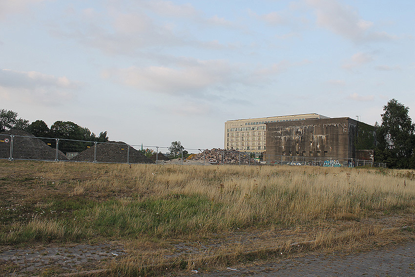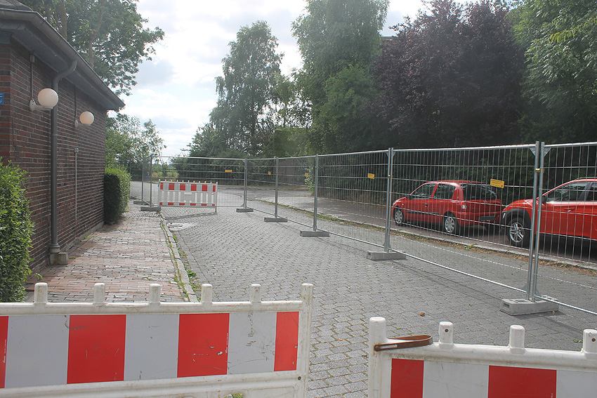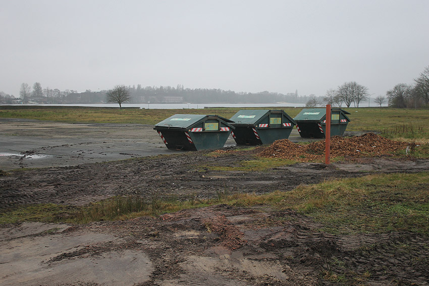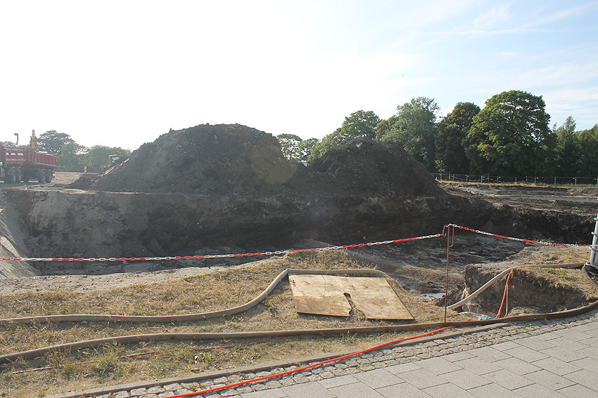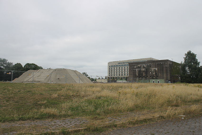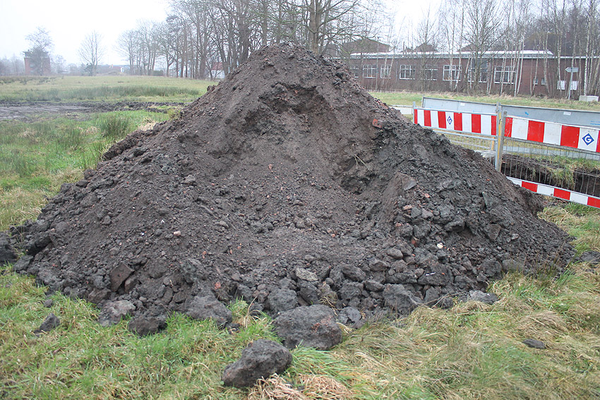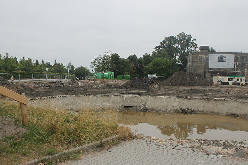 Mittlerweile wurde auch der Gehweg an der Jadeallee abgezäunt. Weitere Mengen Erdreich wurden nordöstlich des Bunkers ausgehoben. Der Tankfundamentbereich ist voll Wasser gelaufen. Es wird sich hierbei um Grund- und Regenwasser handeln.