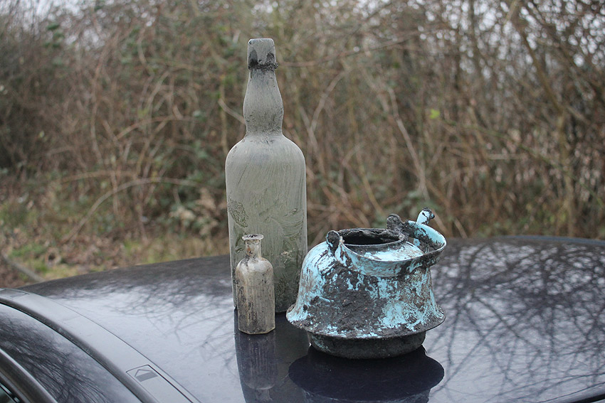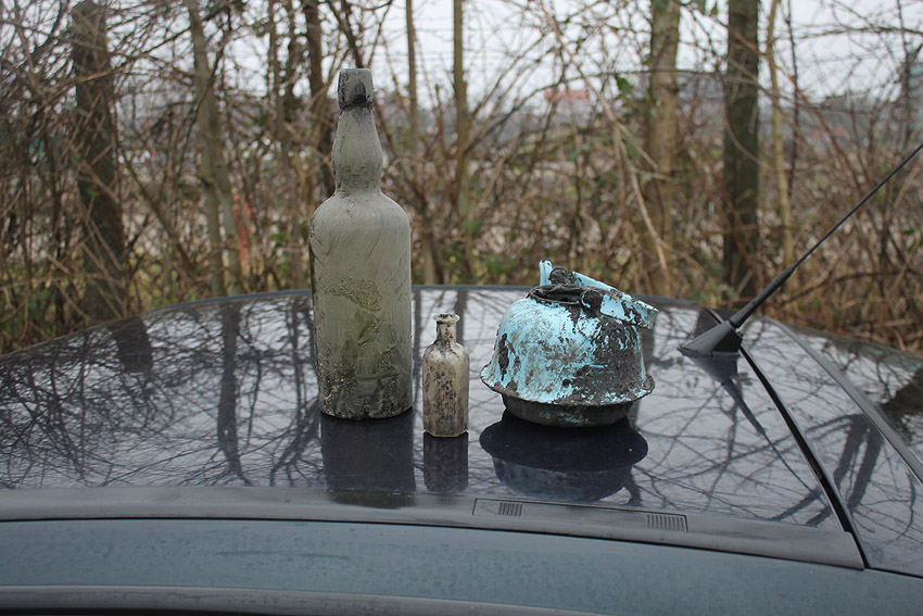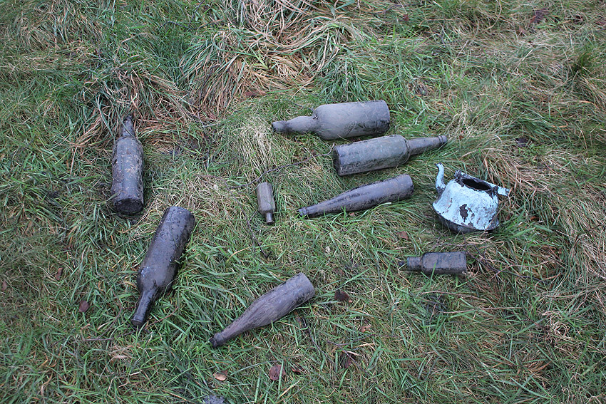 Erste Maßnahmen. - Sondierungen nördlich des Bunkers. Hier befindet sich noch immer die Sohlplatte eines ehemaligen Öltanks im Erdreich. Diese wurde ansatzweise freigelegt und eine Kernbohrung ist durchgeführt worden. Später wurde das Loch wieder verschlossen. Bei den Grabungen sind historische Dinge, darunter Jahrzehnte alte Flaschen ans Tageslicht gelangt... Zum Thema "Flaschen" äußern wir uns allerdings nicht weiter.