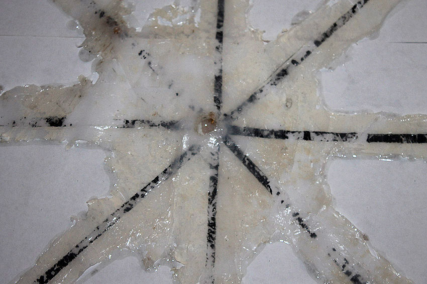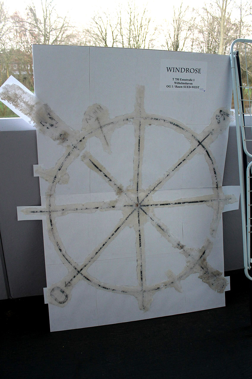 Nachtrag 04.10.12: Aus Fragmenten der zerstörten Windrose konnte in komplizierter Arbeit nun die ursprüngliche blau-schwarze Windrose glücklicherweise zu fast vier Fünfteln wieder restauriert werden. Sie bleibt damit als eines der letzten Relikte des Bunkers erhalten: